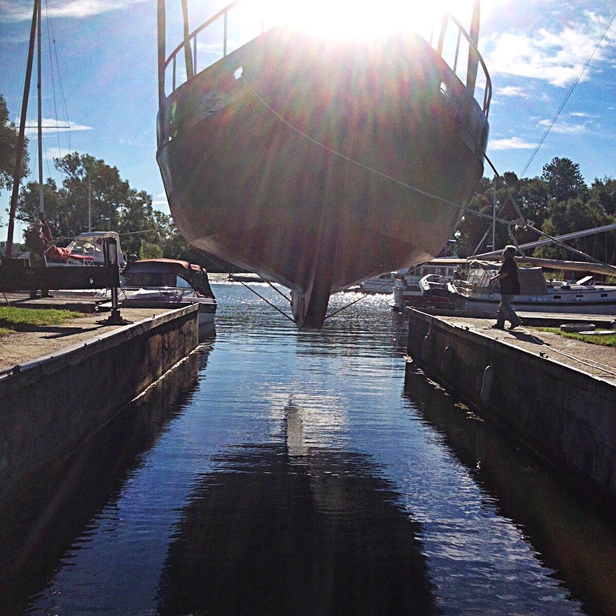 After an extensive search, and many many nights perusing yacht world for the ‘right boat’ we eventually found Monster down the street from Gordon’s Parents country home. It was an unforgettable day to launch our new home on our first Wedding Anniversary. We then had a couple months before we made the transition from land to live aboard. The number one thing we had to do was to downsize extensively, and rid ourselves essentially of a furnished house. We were living in a 3 bedroom, 2 story rental house, with a basement and a back yard and all that accompanies such a lifestyle. Minus a car.