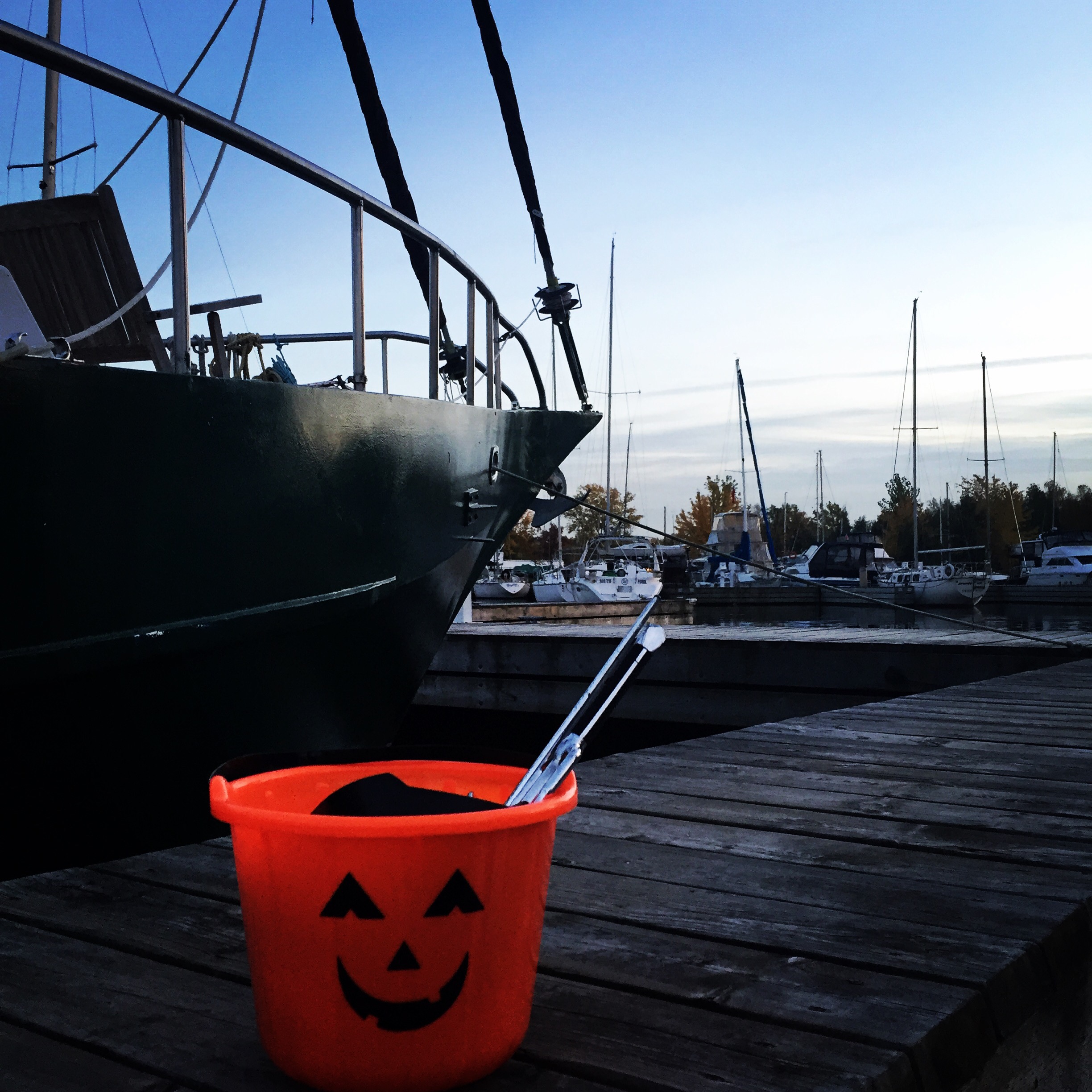 Until we did finally cast off, we continued to commute to school by dinghy, wearing not much more than light jackets and sweatshirts. Gloves on occasion. We couldn’t have asked for better weather for the eve of Halloween . Of course, we arrived at our trick ‘or treating locale by dinghy crossing the harbour on a truly stunning evening.