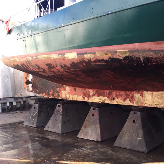 Fortunately, in the days prior we set all the large blocks on which Monster was to sit. We measured and figured how to best lay her into the dock. Monday morning, our haul out day, quickly came. I kept the Boy home from school to partake in the event, not to mention I was in need of Crew. The Boy and I singled up all of our dock lines and waited for the word, and our old friend M was also aboard to help as needed. Our trusty engine idled, warming for the maneuver. Considering I drive a passenger boat for a living, I was nervous. Something about docking our boat, our home, in the Drydock incited a bit of fear and trepidation. When the moment came we cast off, I shifted the throttle into forward, and away we went. I drove her like I stole her, but not really that fast. Hours later as the Drydock slowly deballasted we could see that Monster was perfectly aligned on her blocks. She was sitting pretty. I happily relayed the news and pictures to Gordon over the phone. I was rather pleased with myself!