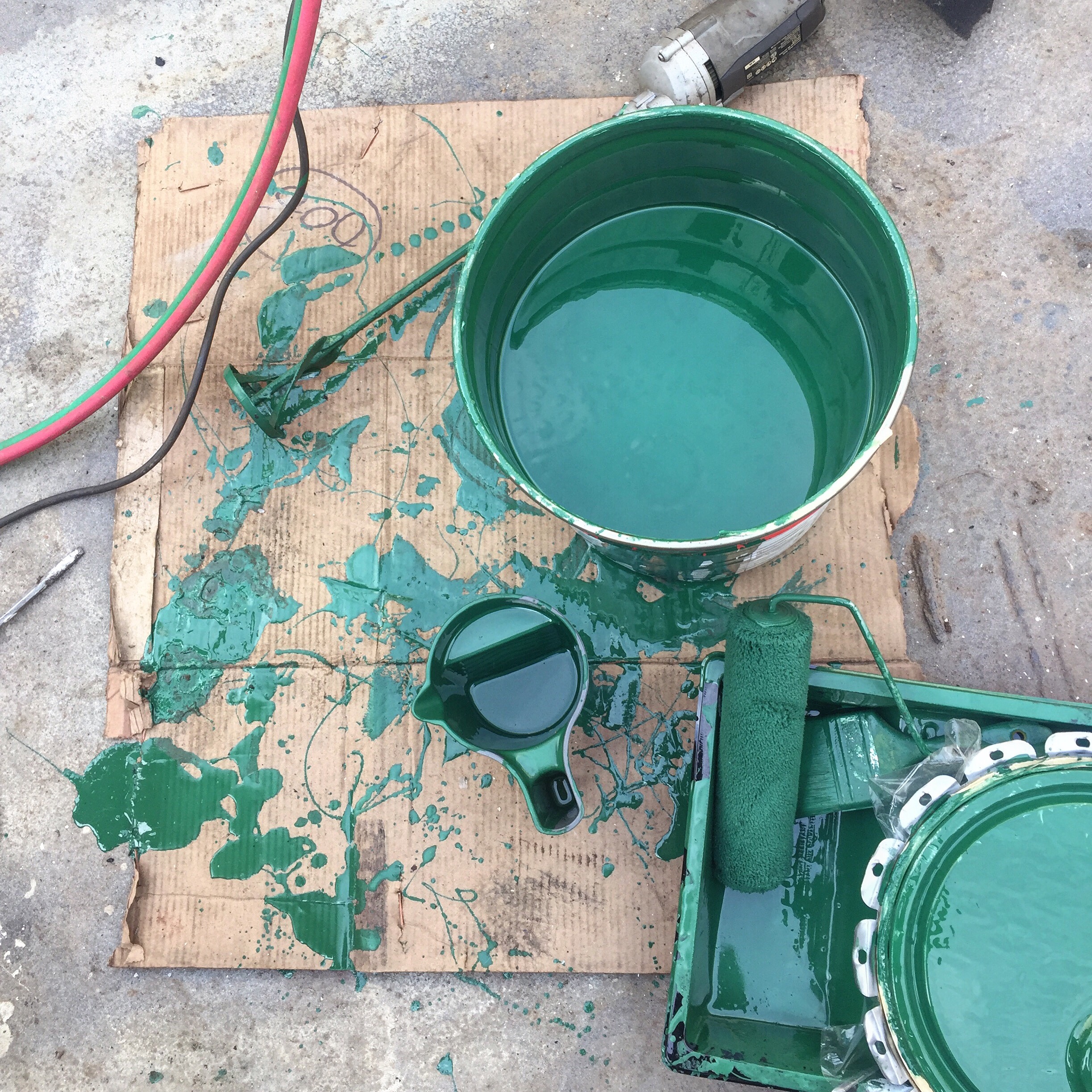 Our hull was painted a slightly different shade of green this time round. We have resigned ourselves, as steel boat owners, that we will forever be painting and have decided not to become attached to any particular color. Though, we rolled and tipped two fine coats of green before it cured in order to apply the tape to mark the waterline.