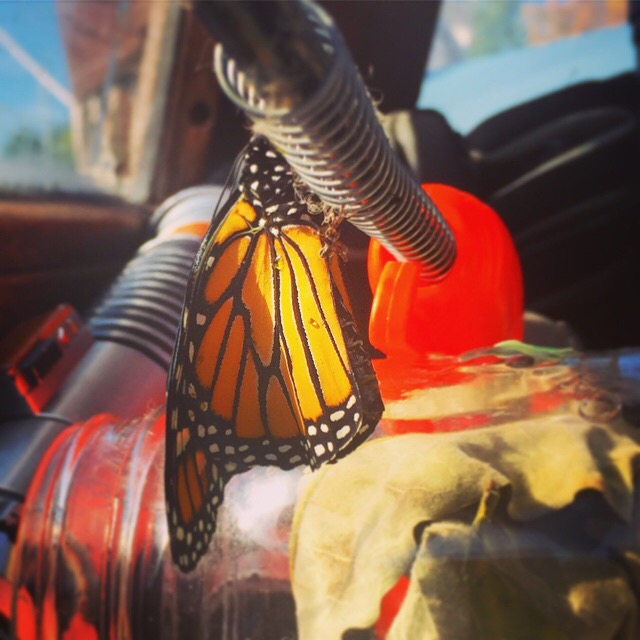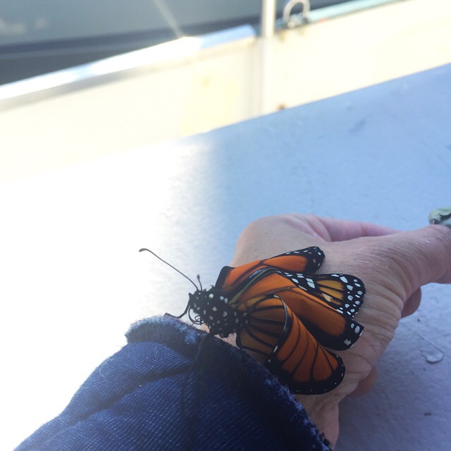 I’ve come to notice the last few days that there are a plethora of monarchs flitting about the Island, and across the water. I watch them dart and hover on the breeze as I cross the Harbour to and fro at work. I’ve noticed so many in fact that it brought to mind the Monarch butterfly we nurtured in our cockpit this time last year. I had started to write about it then , and now seemed like a fitting time to finish the story and share it.