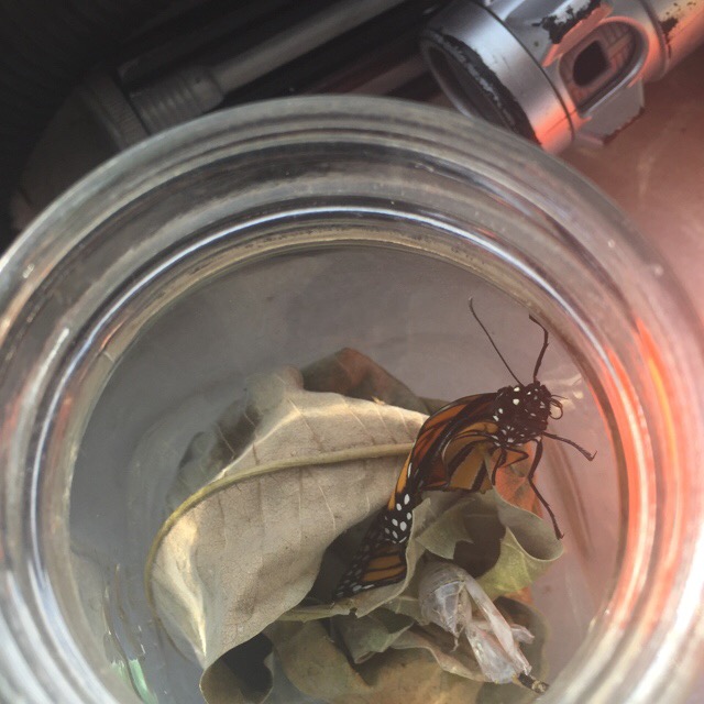 Milky sat in our cockpit, in his jar partly shaded, protected from the wind and rain. Then we went away for a week, on our Road Trip to Lunenburg. Upon our return, we were surprised to find that Milky was still with us. His pupa had since turned transparent, and we could see the beautiful colours of his Monarch wings, rich blacks and vibrant oranges. I was rather surprised and quickly learnt in my reasearch that the cycle of a caterpillar to a monarch usually takes 10-12 days. Our Milky had been cocooned for 17 days. With the jar gently tilted onto its side, Milky finally emerged.