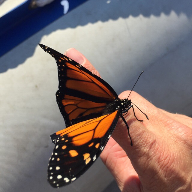 It happened again that we returned to the boat to find that Milky was gone. While I was deeply routing for him to have flown away, in my heart I knew that something wasn’t quite right. This was confirmed when I found Milky floating in the water adjacent to the boat. I quickly jumped into the dinghy and rescued him, placing him back into the cockpit. Gordon and I were to perform two more MOB’s, as in Monarch Over Board. It’s likely that Milky attempted to fly and fell to the water and was carried away by the wind and the movement of the water. W