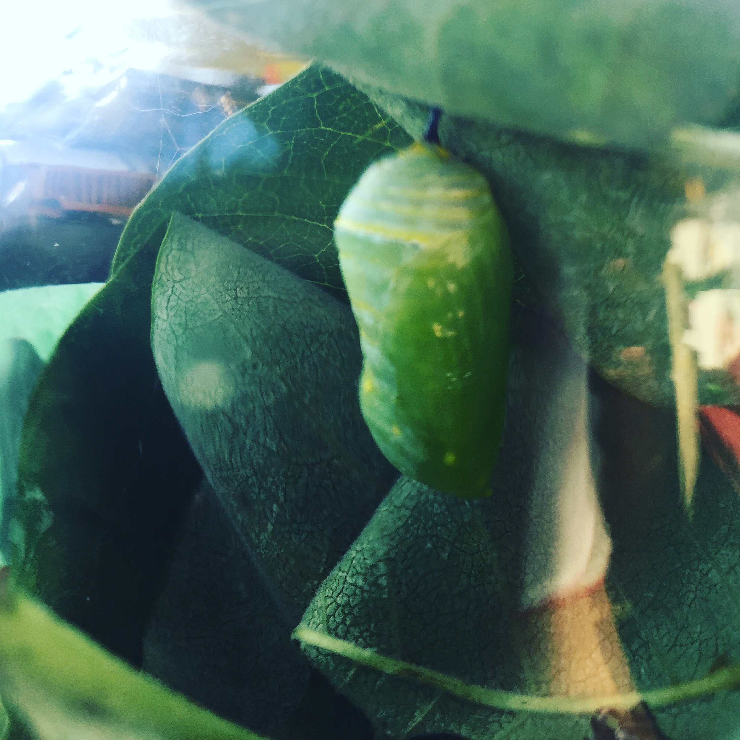 It was early September when our Boy, whom had just started back to school, was studying the life cycle and the chrysalis process of the Monarch butterfly. On the Island, in our Marina, the weeds and foliage are mostly left to their own. Our Son was always on the lookout for milkweed, and lo and behold there was a big plant not too far from our dock. And then, one day, there was a fuzzy caterpillar upon its big broad leaves. The Boy quickly collected this caterpillar in a jar all set to take it to school and add it to his class’s collection. His name was Milky.